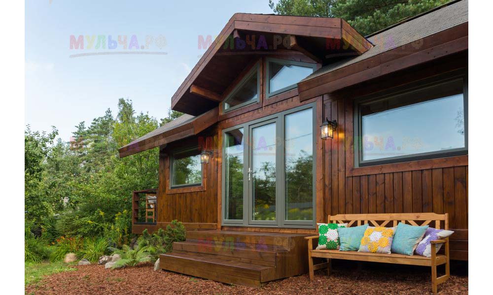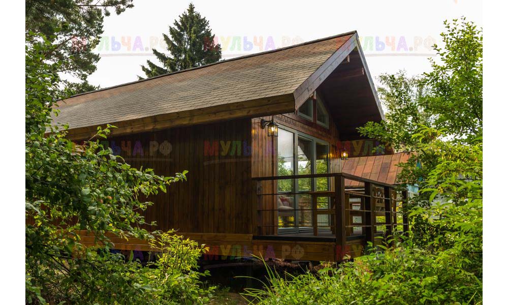 Но не стоит забывать и о территории, которая окружает новый дом. Она тоже нуждается в благоустройстве. И здесь приходят на помощь материалы для ландшафтного дизайна, купить которые вы всегда можете в магазине нашей компании. В этом проекте использовалась кора лиственницы фракции 1-3 сантиметра. Отсыпка корой лиственницы – это из защита от сорняков, и украшение участка. Для повышения эффективности защиты рекомендуется использовать кору лиственницы в комбинации с мембранными мульчирующими материалами.