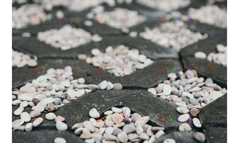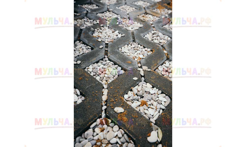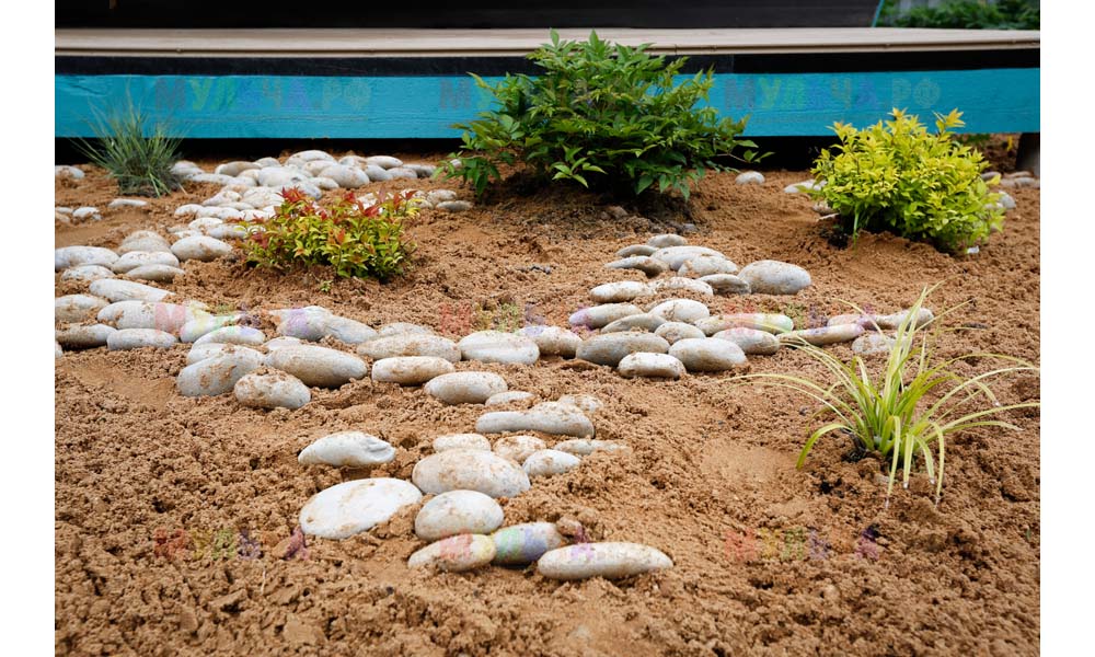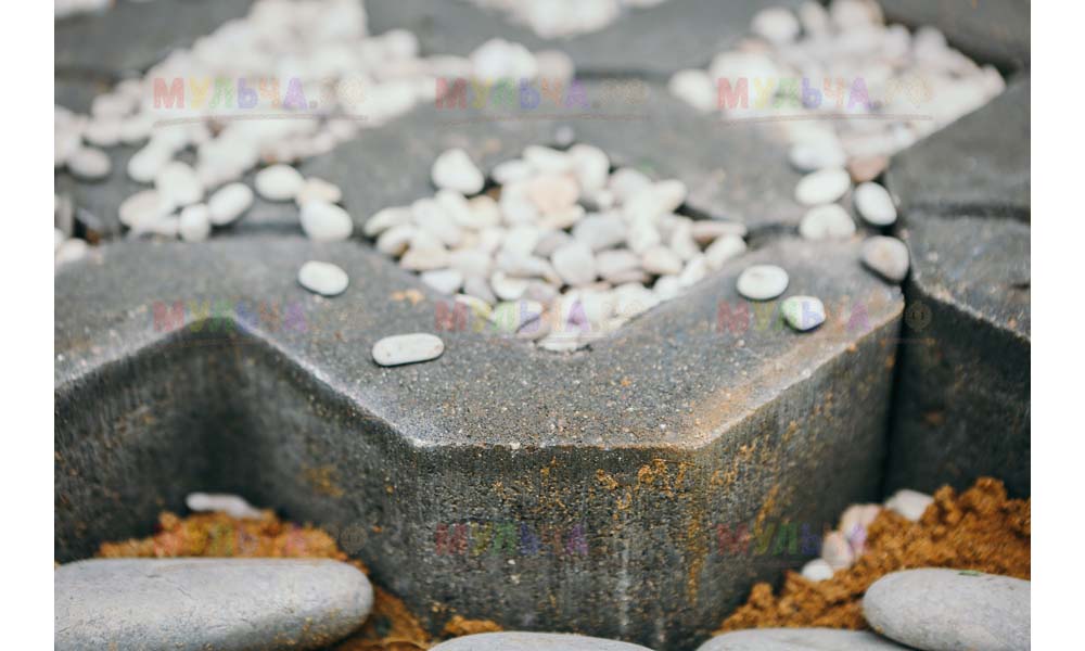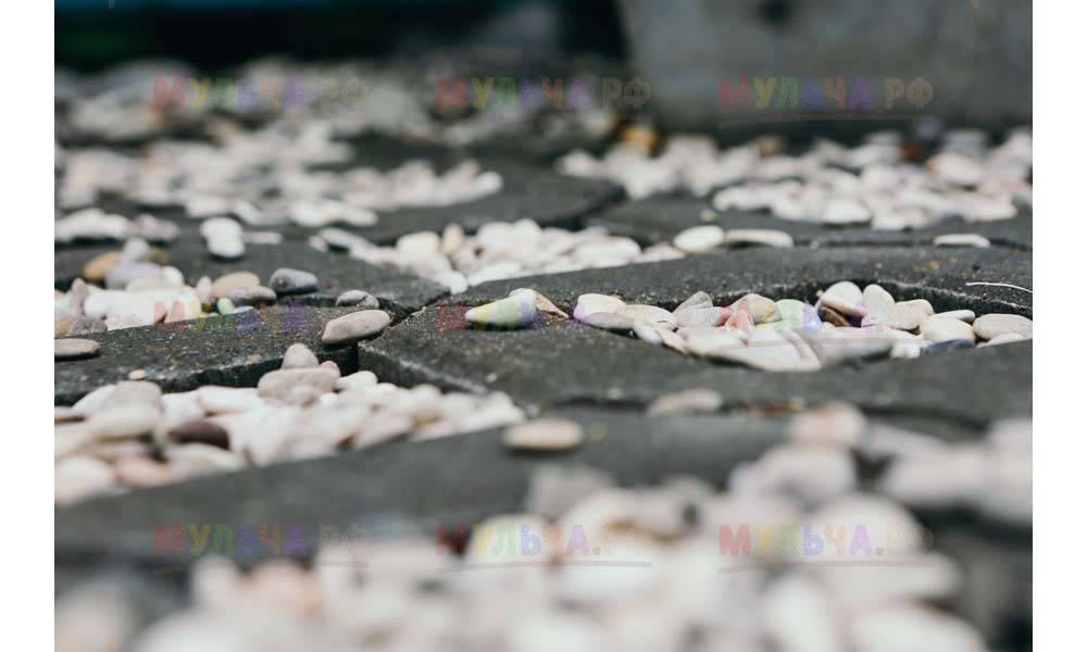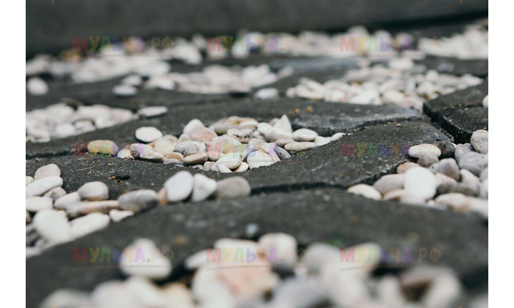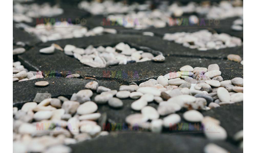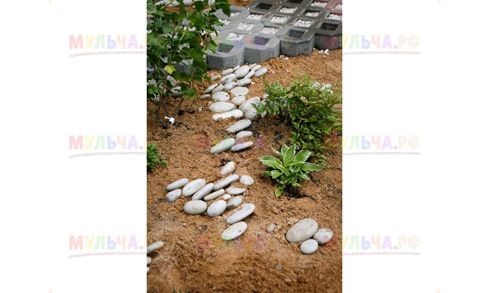 Мульча РФ поставила для проекта гальку мелкой и крупной фракции, мелкая пригодилась для создания садовых дорожек. Основа дорожки выложена тротуарной плиткой, меж которыми остались пустоты, которые были засыпаны мелкой морской галькой.