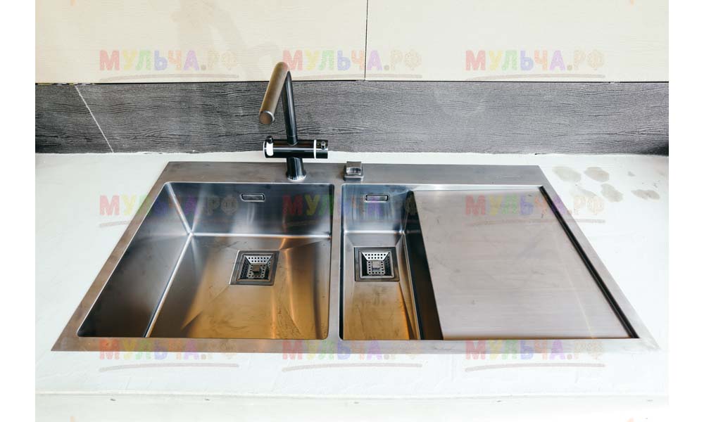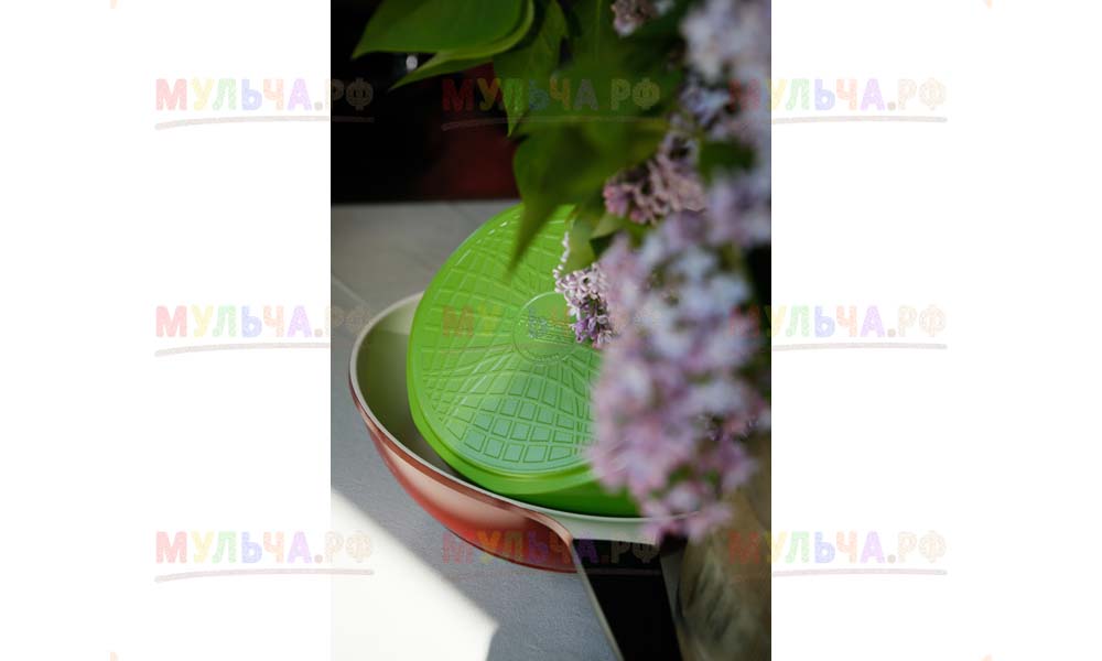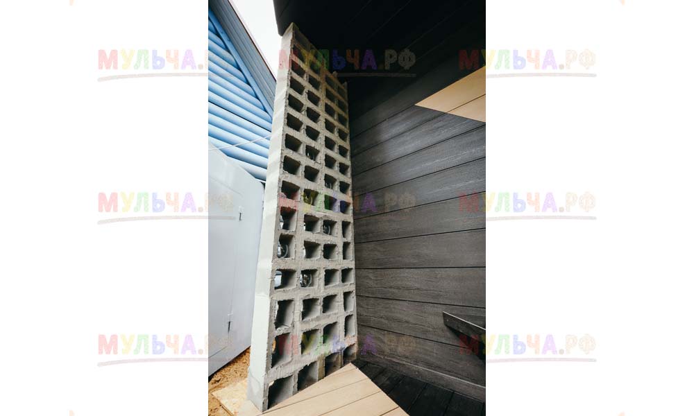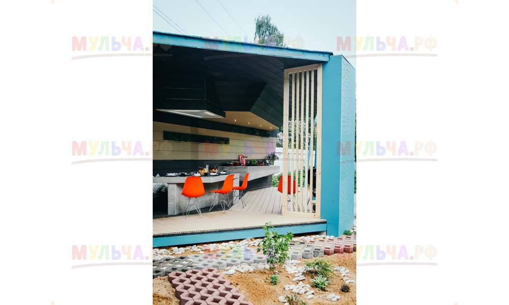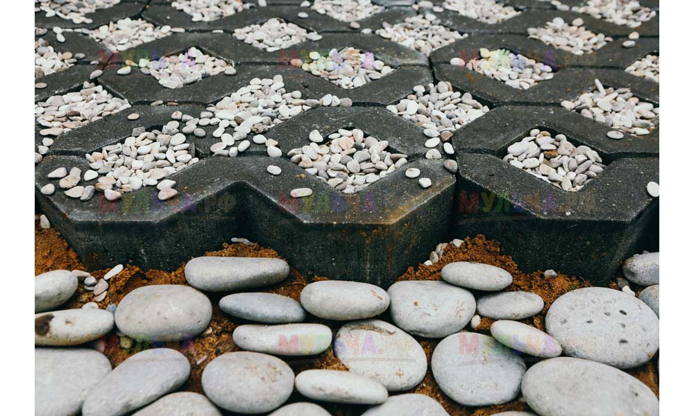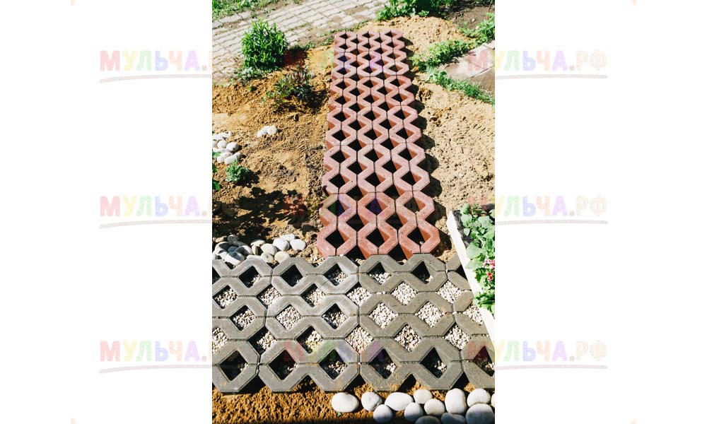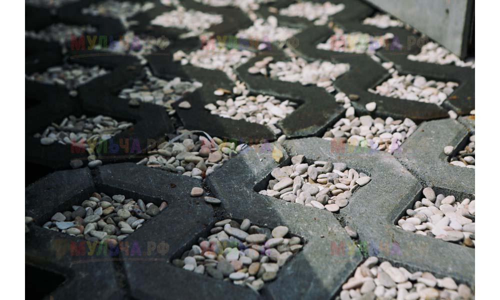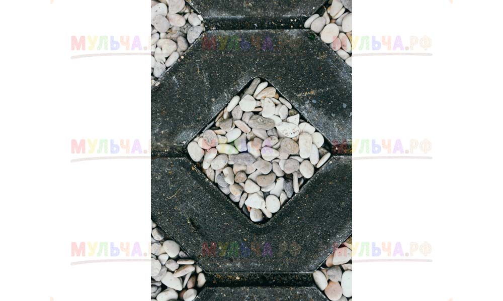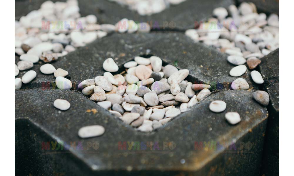Мульча РФ поставила для проекта гальку мелкой и крупной фракции, мелкая пригодилась для создания садовых дорожек. Основа дорожки выложена тротуарной плиткой, меж которыми остались пустоты, которые были засыпаны мелкой морской галькой.